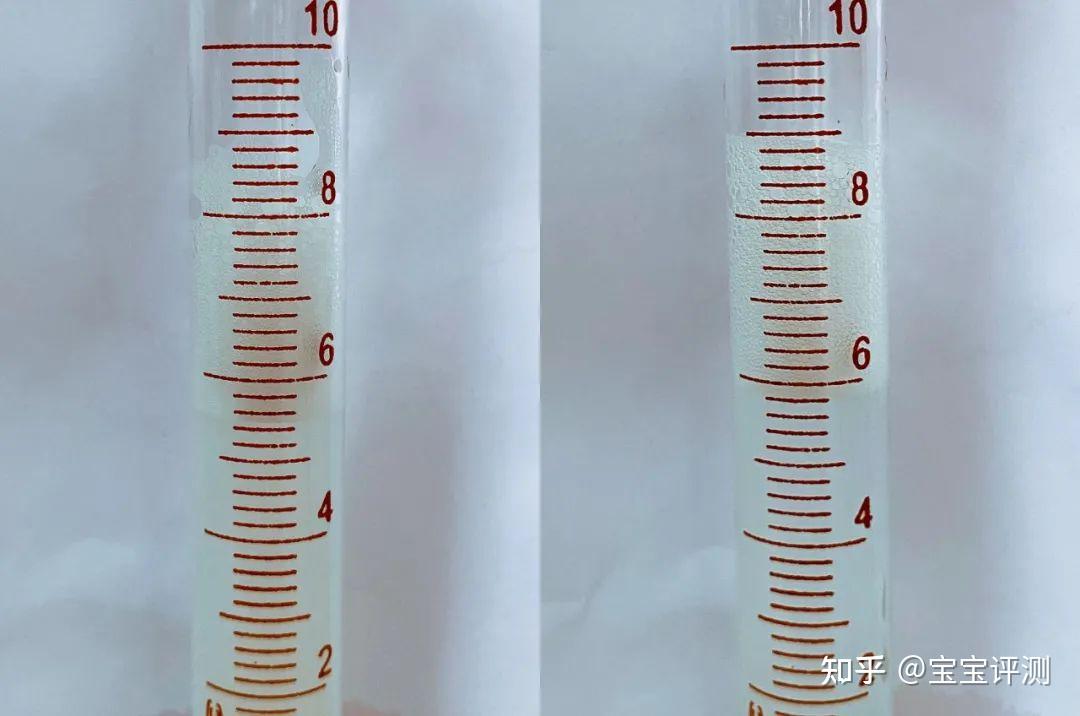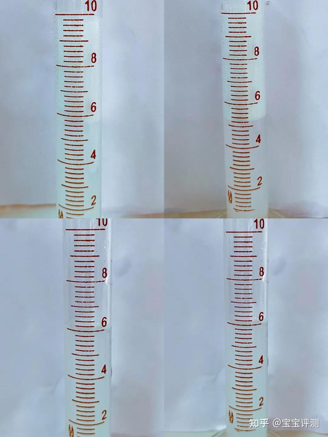 笨爸爸這次對一切牙膏的起泡狀況停止了測試,取等量豌豆大小的膏體,放入10mL的量筒中,參與6mL水,來回震蕩量筒30次,靜置量筒5秒,觀察泡沫高度、泡沫量以及氣泡大小。