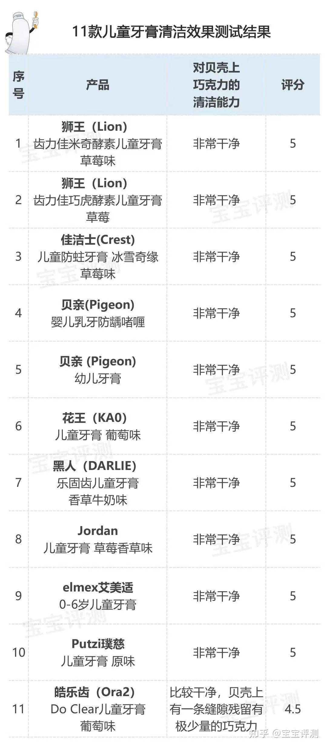 11款兒童牙膏中,除了皓樂齒在清潔效果上稍遜,貝殼上有一條縫隙殘留有極大批的巧克力。其他10款均有很好的清潔才干。