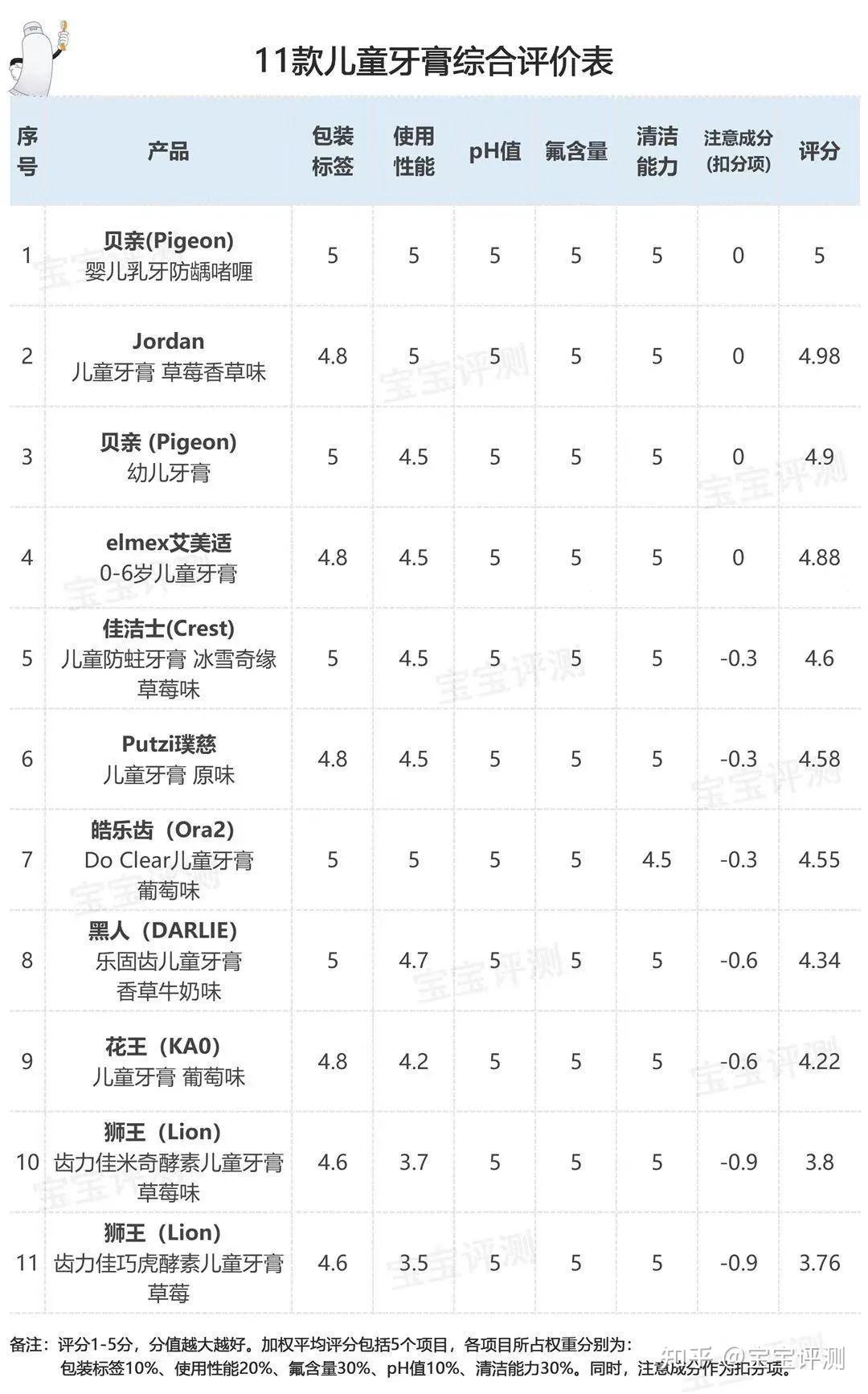綜合包裝標簽、運用功用、氟含量、pH值、清潔才干等5個評價目的的得分,笨爸爸停止了加權平均,同時對留意成分停止了扣分,給出了一個總排名給寶媽們做參考,詳細如下。