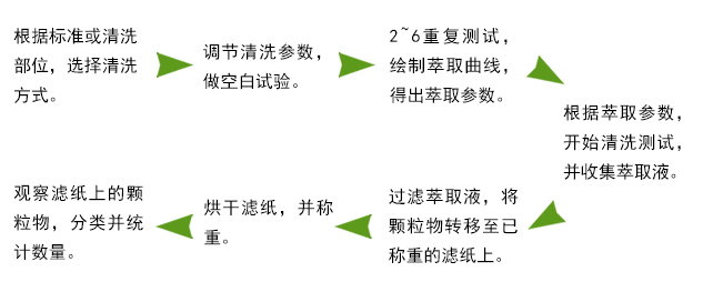 使用某種或多種機械方法,通過清洗液在規(guī)定的時間內(nèi),把污染物從樣品上分離到清洗液中,最終把萃取液過濾到測試濾膜上,分析濾膜上的顆粒重量、數(shù)量、性質(zhì)等。